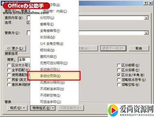 H”打开查找替换窗口,然后单击“高级”或“更多”,在“特殊格式”中选择“手动分页符”;