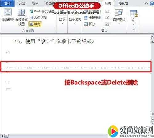 先将Word视图模式设置成“草稿”(注意Word2010版和Word2013是“草稿”,2003、2007设置为“普通视图”),然后我们就可以看到一条横虚线,这就是分页符,它就是导致我们出现空白页的原因,将其删除,再回到默认的“页面视图”空白页就木有了。