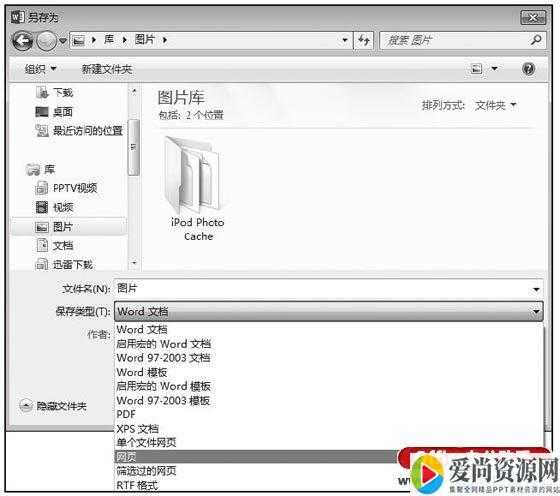 步骤2:弹出“另存为”对话框,在“文件名”方框中输入文件名,如“图片”。并在“保存类型”方框中选择“网页”选项,如图2所示。设置完毕后,单击“保存”按钮。