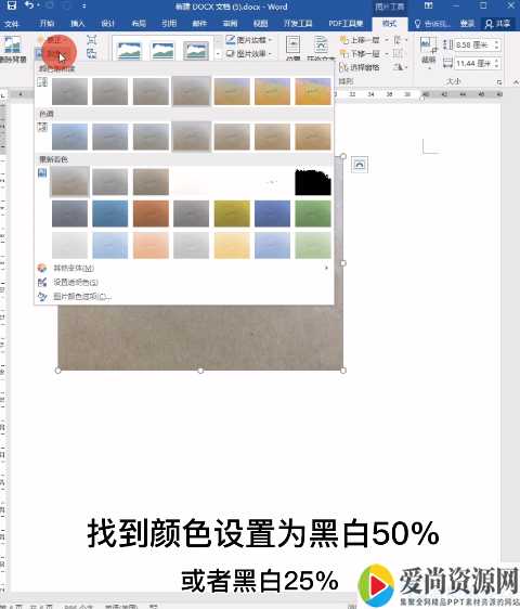 2、然后点击图片工具格式找到颜色,设置为黑白50%,然后选择透明色点击一下图片,这样就完成了。