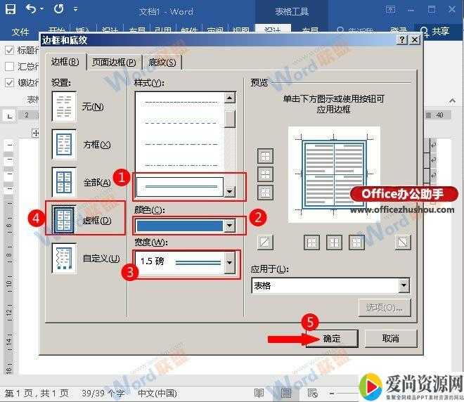 3、弹出“边框和底纹”对话框,在“边框”窗口下,将样式设置为双横线,颜色为蓝色,宽度位1.5磅,设置为“虚框”,再单击“确定”按钮。