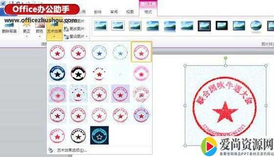接着插入一个五角星,将其填充为标准红色,最后再仿照刚刚插入文字艺术字的步骤插入一系列数字,并设置更随路径为下弯曲。然后截图,将印章截取为图片,点击该图片,按照下图所示调整其颜色或者艺术效果,以使其更加逼真。