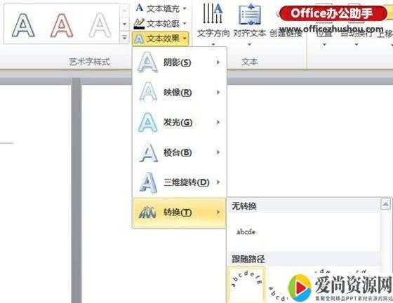 接着插入艺术字,选择适当艺术字样式,输入相应文字,然后在“艺术字样式”处选择文本效果,选择“转换”中的“跟随路径”中的第一个命令,此时艺术字即会向上弯曲,将其移动到圆形形状里并调整艺术字弯曲力度以使其匹配圆形上弧度。