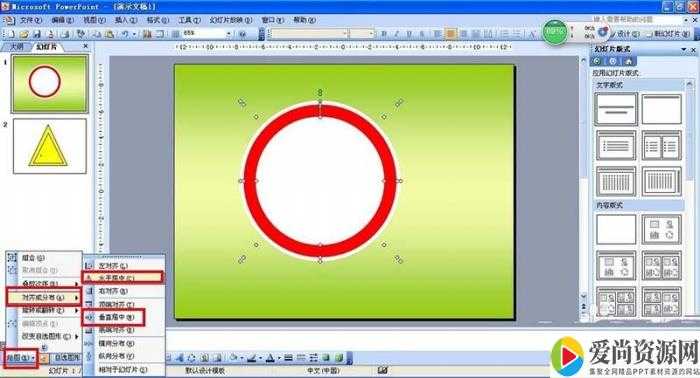 3、按照步骤1的方法再画一个白色的小圆在红色正圆的上方,然后全部选择这三个圆——点击绘图——对齐或分布——选择水平居中,然后再次选择垂直居中。