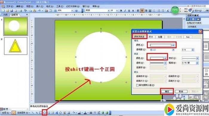 1、以禁止非机动车的交通图标为例。打开PPT2003——在绘图工具栏那里选择椭圆——按shitf键画一个正圆——双击正圆——颜色和线条——填充选择白色,线条颜色也是选择白色——点击确定。