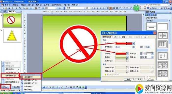 4、选择矩形工具——画一个矩形——点击绘图——旋转或翻转——自由旋转——如图旋转一定的斜度,变成一根斜杆——双击矩形,颜色填充和线条都是红色——点击确定。