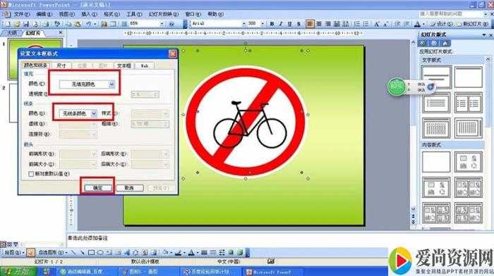 6、最后,双击文本框——颜色和线条,颜色填充和线条颜色都选择无填充颜色——点击确定。这样一个禁止非机动车的图标就制作好了。