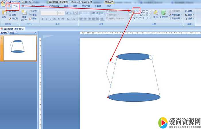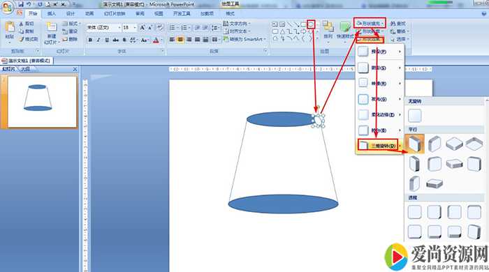 选择椭圆,在小椭圆上画一个更小的椭圆——形状填充选择白色——形状效果选择三维旋转——在平行中选择:等轴左下。这样就画好壶身了。