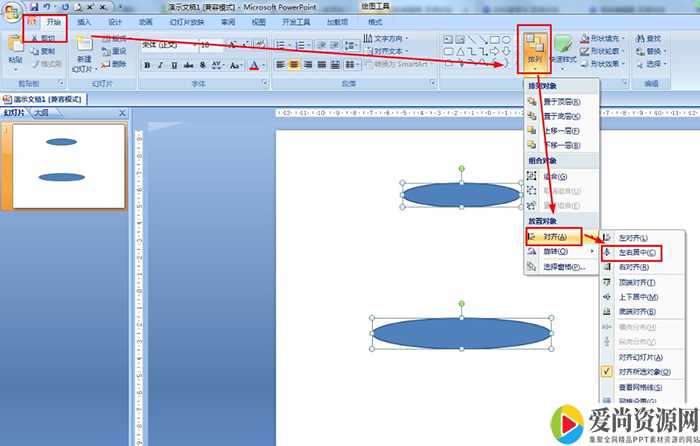 选择两个椭圆——开始——排列——对齐——左右居中。