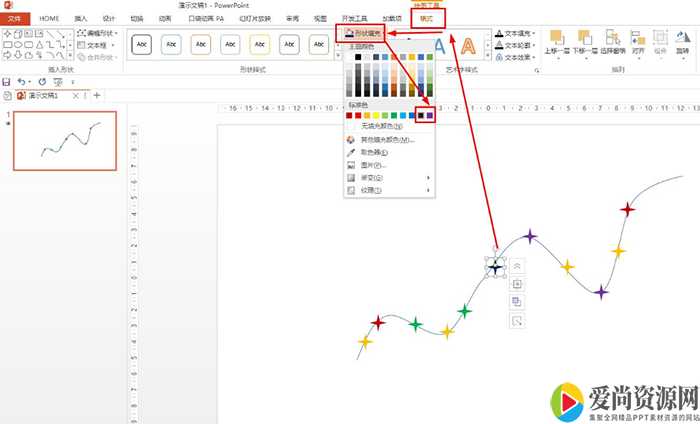 按Ctrl键不断拖动复制星形到曲线其它地方——格式——形状填充,设置不同的颜色。