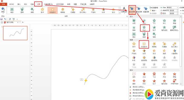选择星形,动画——添加动画——进入动画选择形状——强调动画选择:彩色脉冲。