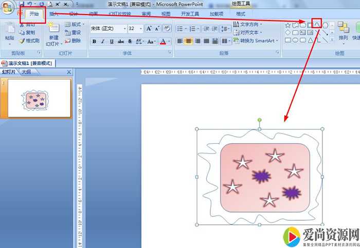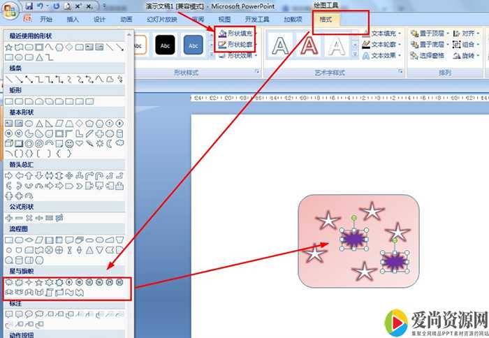 格式——插入形状——星与旗帜——选择星星形状与其它形状插入到圆角矩形内——形状填充选择填充的颜色——形状效果,设置阴影与发光效果。