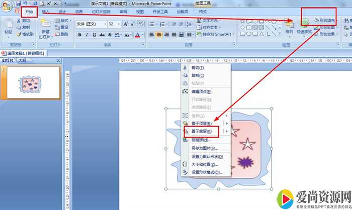 选择不规则形状——开始——形状填充,选择浅蓝色——右击——置于底层。