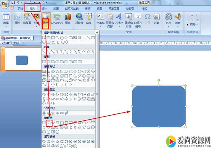 插入——形状——流程图——可选过程形状(圆角矩形)——画一个圆角矩形。