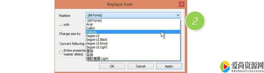 新弹窗口的Replace的下拉窗口,可以看到打开PPT的使用过的所有字体。如下图2处。