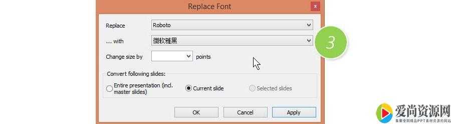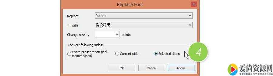 slide”,什么意思,只改一张PPT的字体。我们是要替换所有的PPT页面的字体。所以做上面操作前,需要先Ctrl+A全选所有的幻灯片,然后将选项改为“Selected