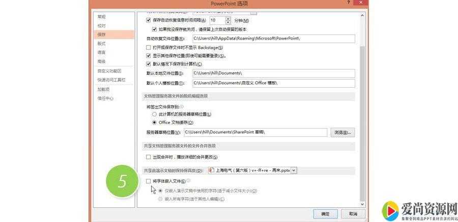 具体操作如下:把“文件-PowerPoint选项”中,将“保存”中的“将字嵌入文件”的勾去掉。(下图5处)在使用前面的替换字体功能就OK了。