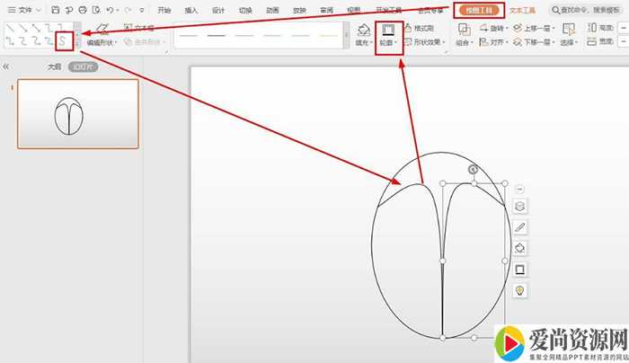 绘图工具——选择曲线,在椭圆形内画一个Y字形——轮廓设置为黑色。