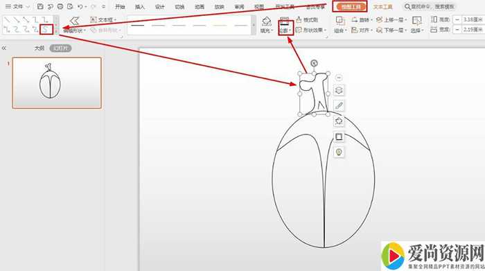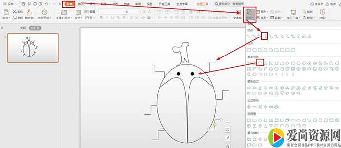 开始——形状——肘形连接符,画虫子的脚,设置轮廓为黑色——用椭圆画眼睛,填充黑色。