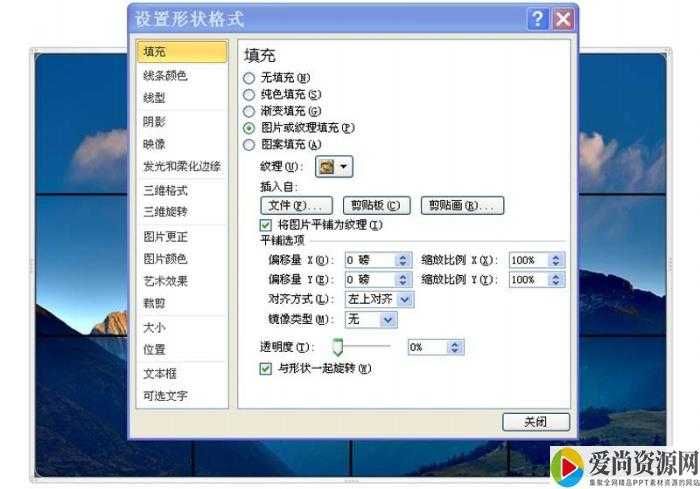 4、右键单击表格从下拉菜单中选择设置形状格式选项,勾选图片或纹理填充,选择剪贴板,并勾选将图片平铺为纹理选项。