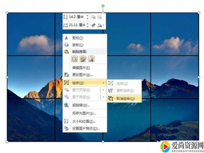 6、右键单击表格,从下拉菜单中选择组合-取消组合,再次执行取消组合命令,这个时候图片就被分割了。