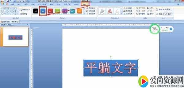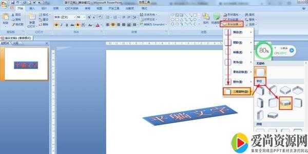 5.在形状效果下拉菜单点击:三维旋转——平行——离轴1上 。