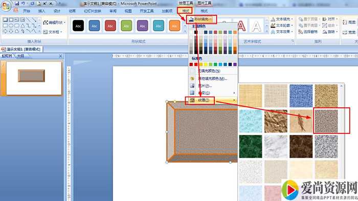 绘图工具——格式——形状填充——纹理——选择沙滩纹理。