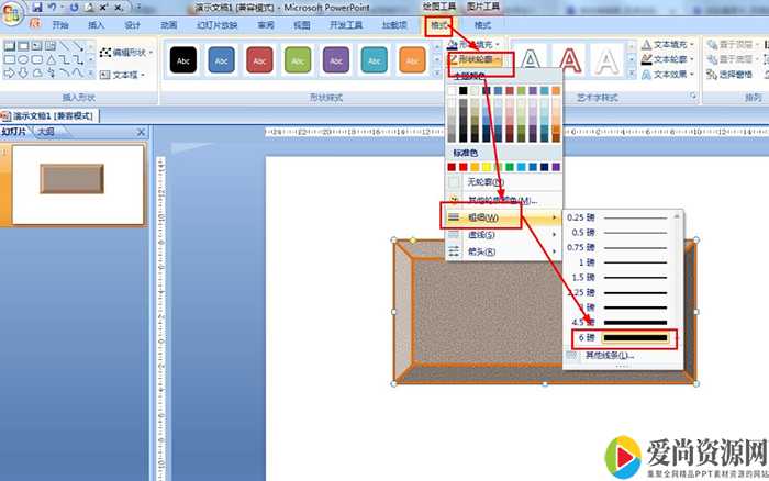 绘图工具——格式——形状轮廓——橙色——粗细设置6磅。