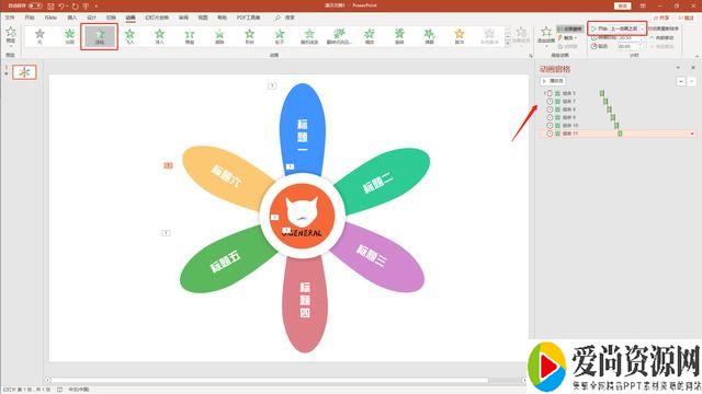 添加文字后,给花瓣逐一添加“淡化”动画,然后我们将后五个花瓣都播放改成“上一动画之后”(图4)。
