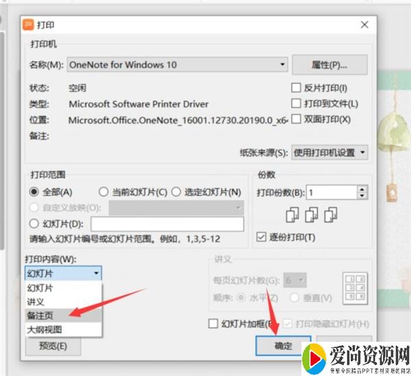 2.然后这个时候会弹出一个打印的对话框,我们只需要在弹出的对话框中,将原先的打印内容更改为备注页然后再点击确定就可以了: