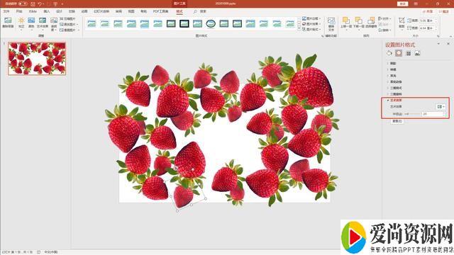 为了凸显层次关系,我们将小的图片设置模糊效果,设置图片格式“艺术效果”中选择“虚化”,并将虚化后的小草莓放到底层,形成“近大远小”、“近实远虚”的视觉(图2)。