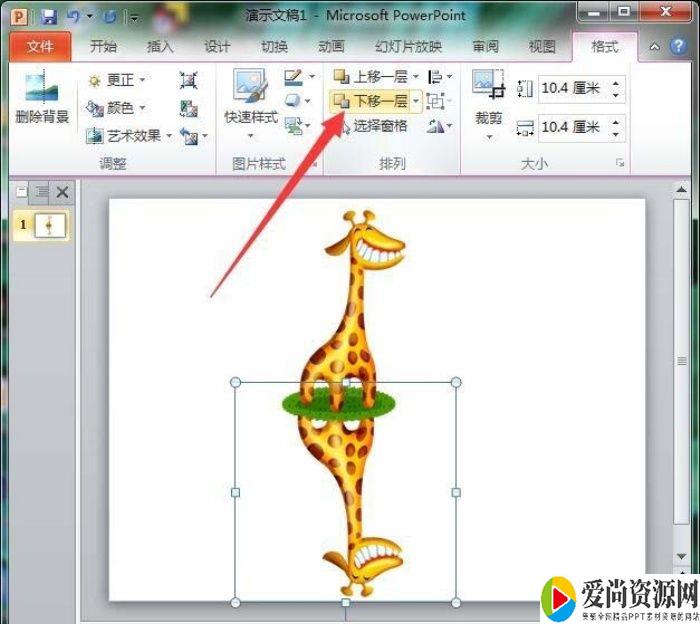 6、再点击排列功能区中的下移一层,把要作为倒影的图片移动主图片的下方。