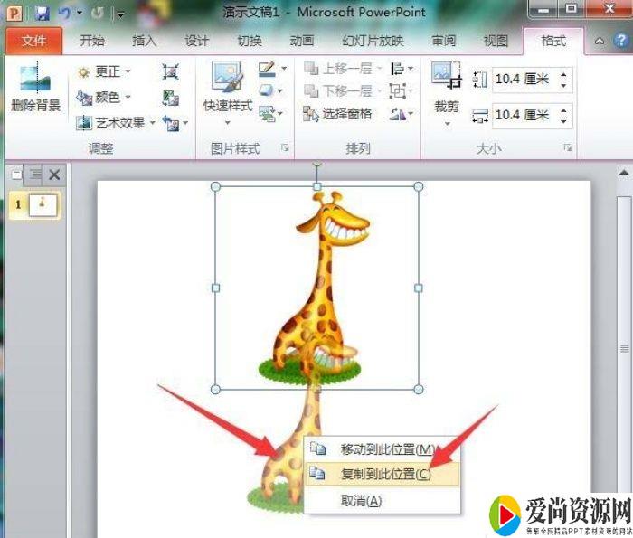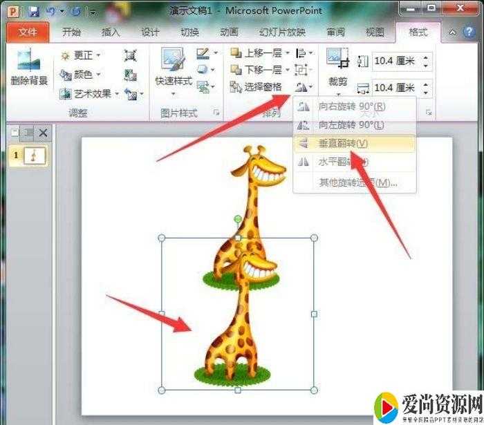 5、选中复制出来的图片,点击格式选项卡,点击排列功能区中的旋转按钮,点垂直翻转。