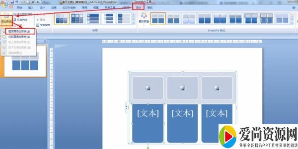2.SmartArt工具的设计——添加形状——在后面添加形状,添加多两个形状。