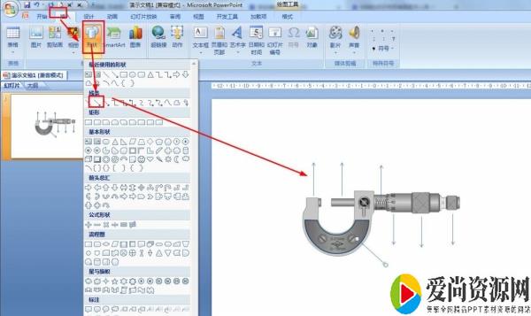 2.插入——形状——箭头——用箭头连接千分尺的每个部件。