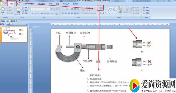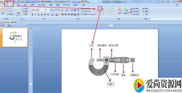 4.开始——选择绘图中的文本框形状——在箭头那里插入文本框,输入千分尺各部件名称。