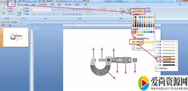3.选择所有箭头——开始——形状轮廓——红色——粗细为3磅。