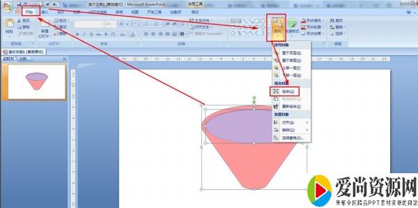 5.删除SmartArt关系图——选择复制粘贴的所有形状——开始——排列——组合。