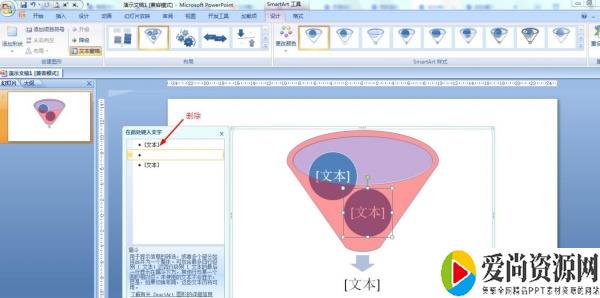 3.在SmartArt工具中点击设计——文本窗格——点击漏斗的文本——按Backspace后退键删除漏斗内三个文本框。