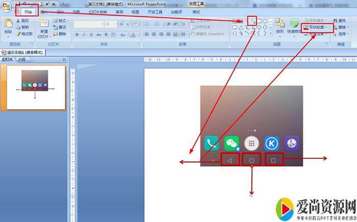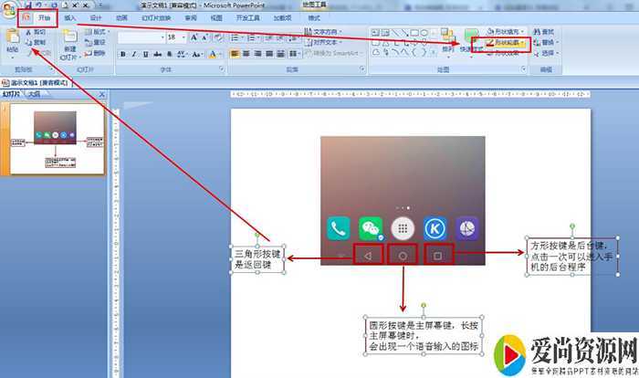 开始——绘图——选择矩形,圈住三个按键图标——形状填充为无颜色填充,轮廓设置为红色。