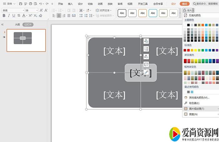这个样式就插入幻灯片中了,再选中其中一个文本框,点击“格式-填充”中的“图片或纹理”中的“本地图片”