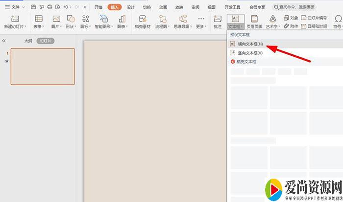然后点击导航栏上的“插入-文本框”选择“横向文本框”