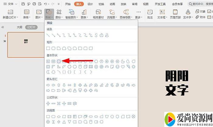 然后再点击导航栏上的“插入-形状”选择“椭圆”