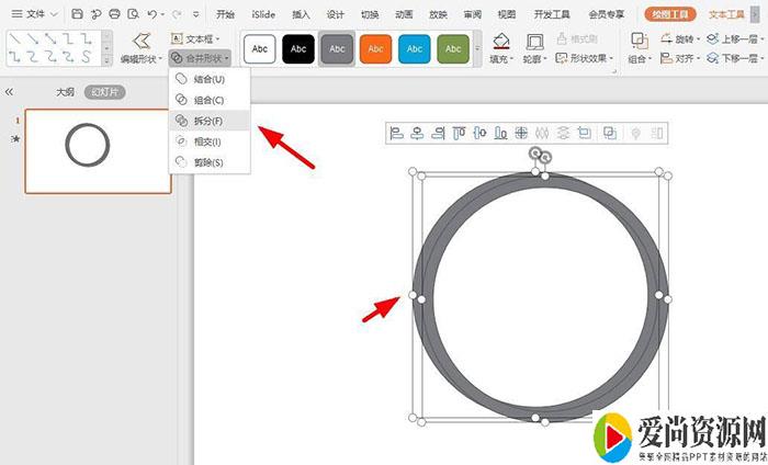 然后选中两个圆环形,点击“合并形状-拆分”