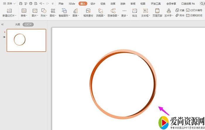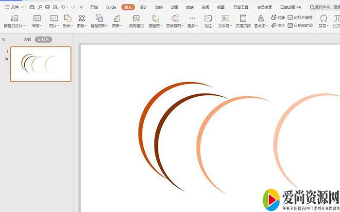 打开ppt,点击导航栏上的“插入-形状”选择“空心弧”