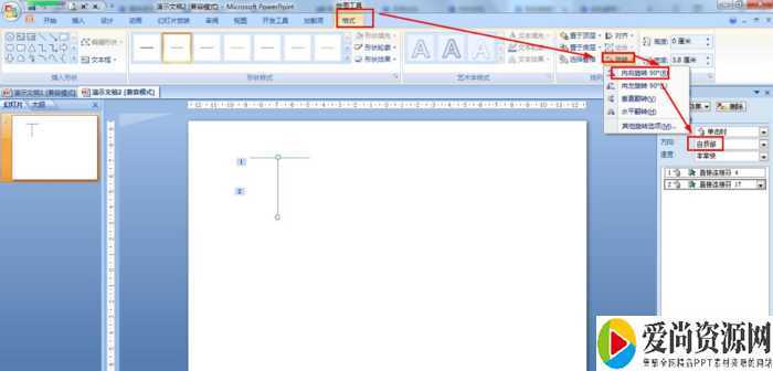 复制横线并粘贴——格式——旋转——向右旋转90°——在右侧的自定义动画中设置方向为:自顶部。