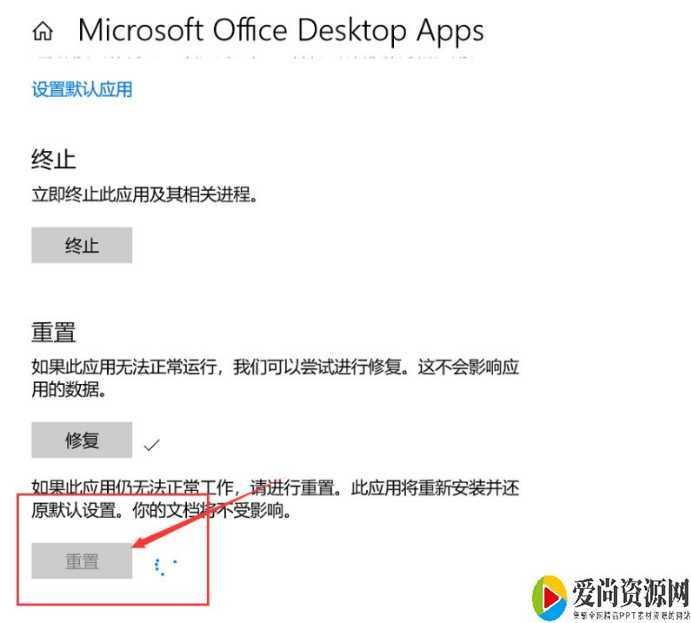 最后,在高级选项中选择‘重置’,稍等1分钟后打开PPT即可
