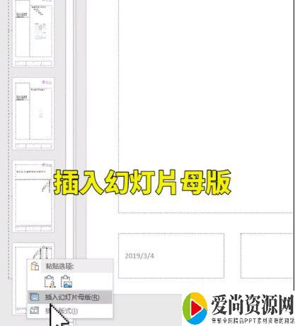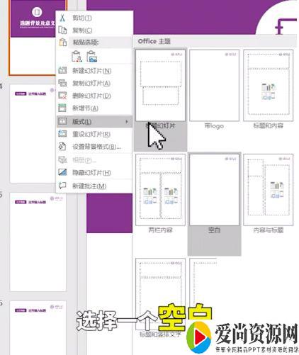 四、如果你的其中一页不想要logo,我们可以在视图当中来到幻灯片母版,我们来到最后可以右键插入幻灯片母版,再关闭母版视图,右键在版式当中选择一个空白,这一页就没有logo了。