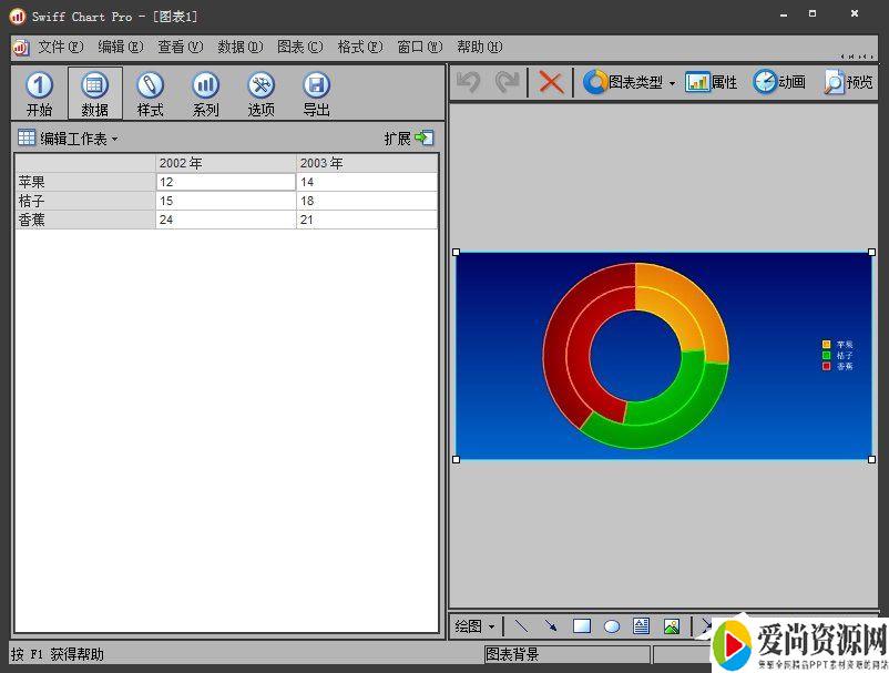 7、图表动画是做好了,但万一数据要临时添加修改怎么办呢?回到SwiffChart主界面,找到“数据”项,可以通过这里进行插入/删减行列、数据添加/修改等动作,是不是有点迷你Excel的味道?