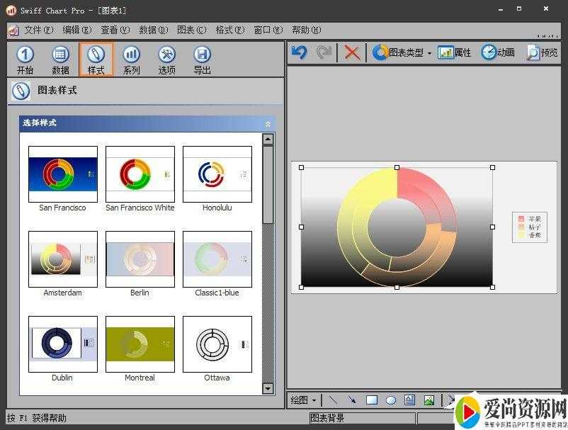 6、当然,默认的动画效果也许未必如你所选,找到主界面的“样式”按钮,还能对动画样式进行选择,SwiffChart预置了足够的动画效果,任意选择一个,都可以在界面分栏右侧看到动画效果,非常直观。
